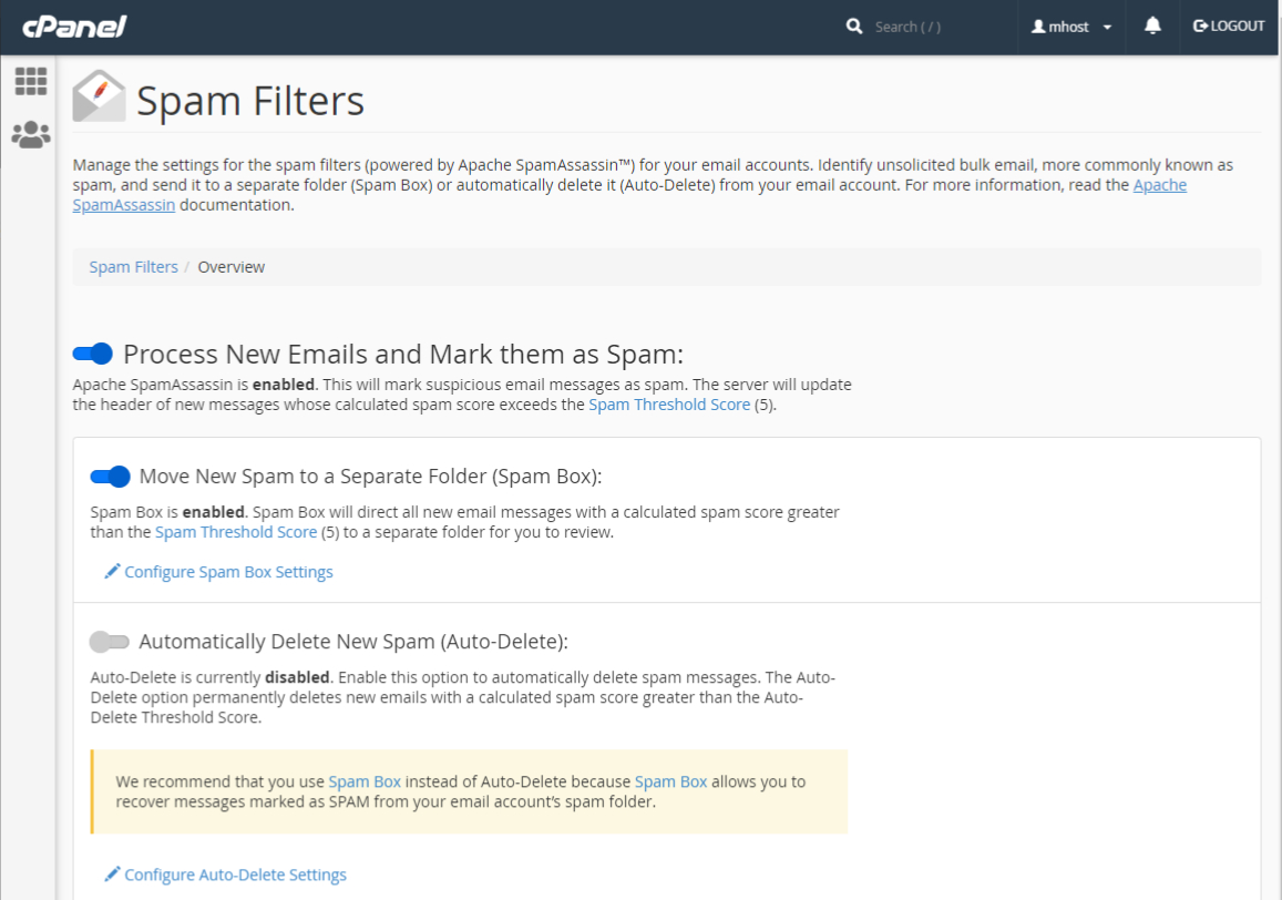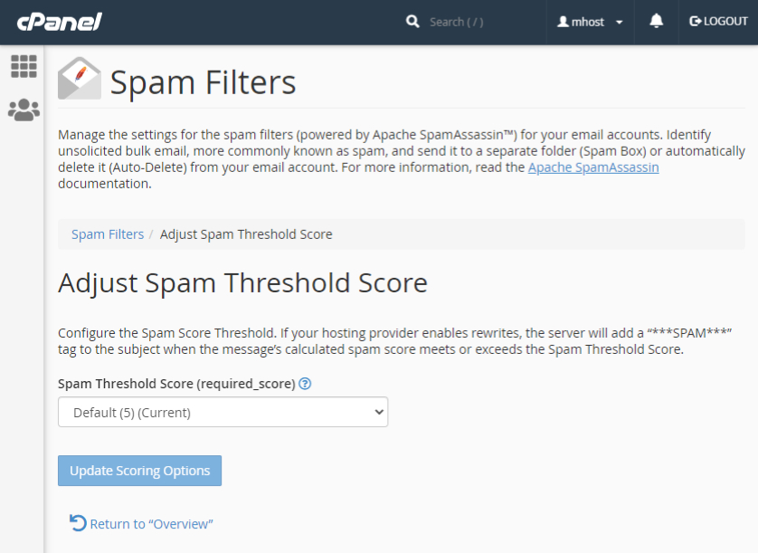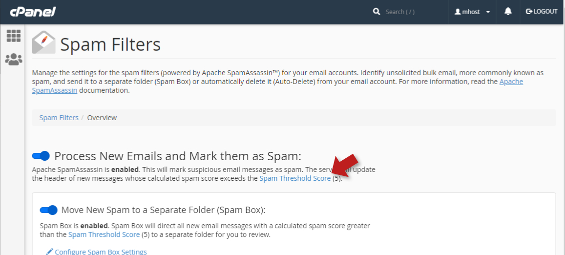 When enabled, Spam Filters will mark suspicious email messages as spam. The filter will add a “***SPAM***” tag to the subject of the messages whose calculated spam score exceeds the Spam Threshold Score.