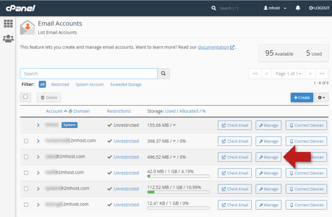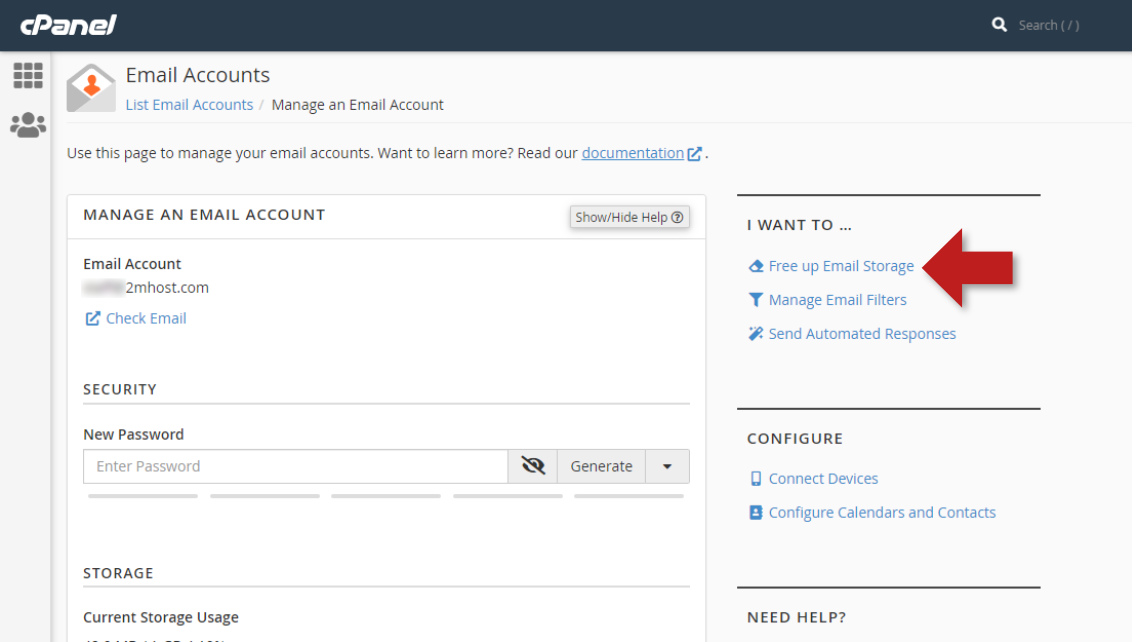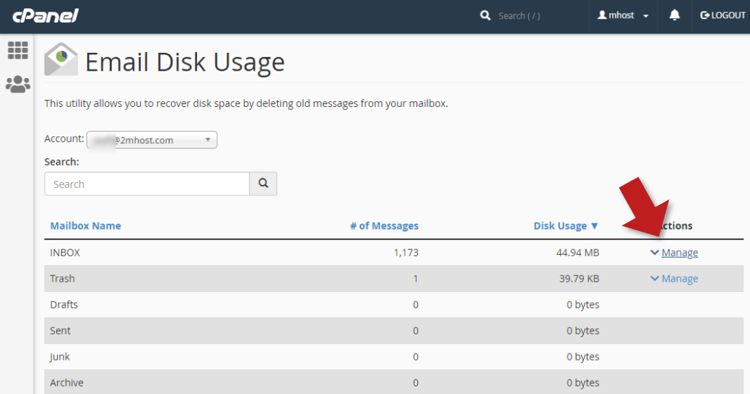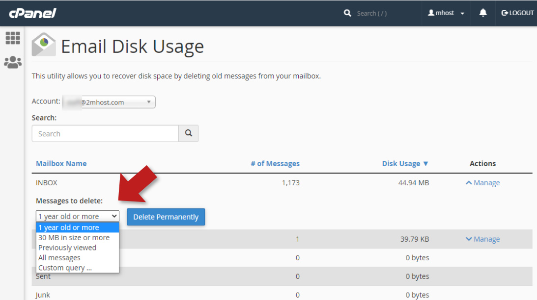 cPanel offers great interfaces to check the total email disk usage of your hosting account and detailed disk usage of each mailbox. Also provide a tool to delete old messages to free up disk space. Here is how to use them: