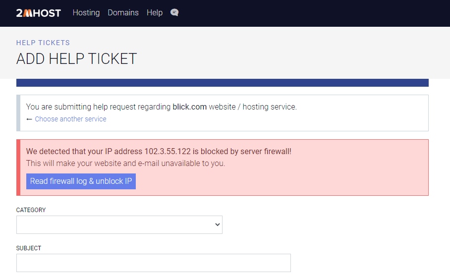 When attempting to submit a support ticket in admin area, our system automatically checks your connection's IP address against your hosting server's firewall. If your IP is blocked, you will receive a notification message indicating the issue: