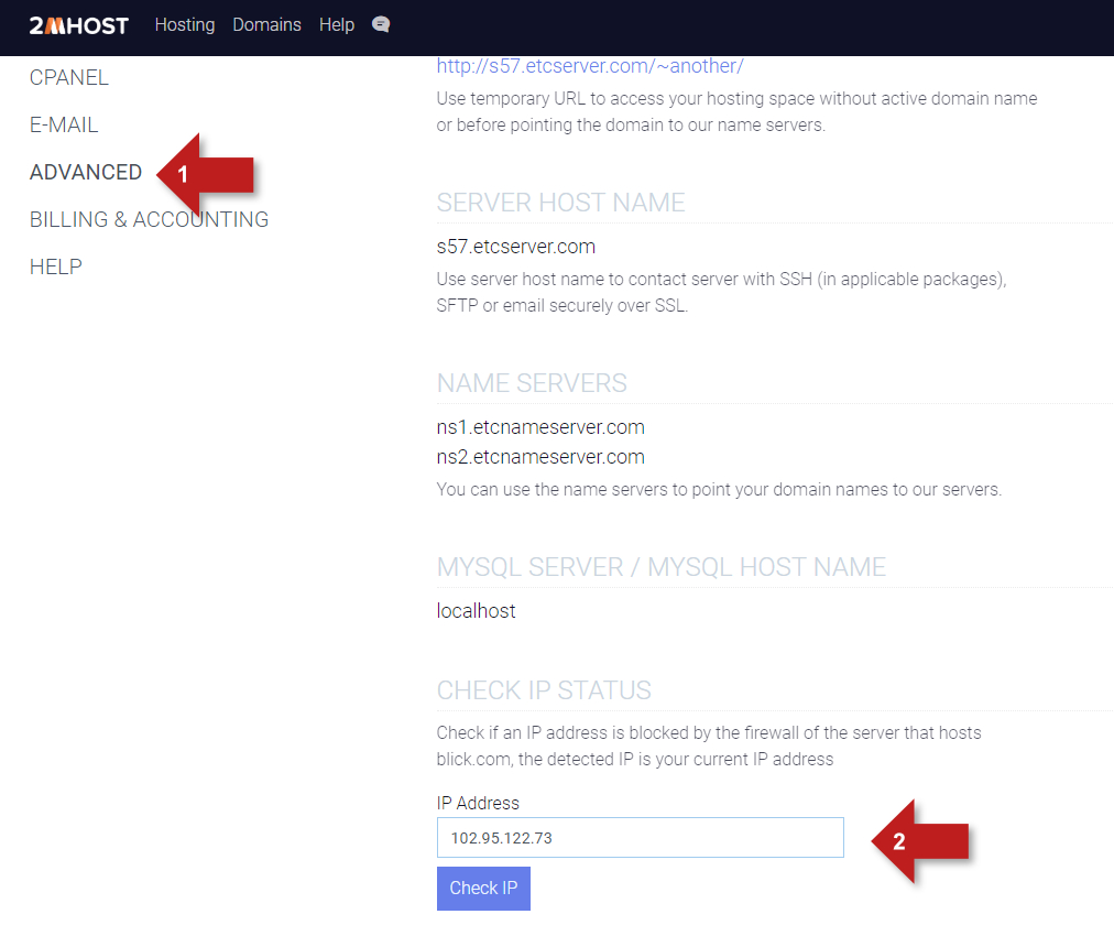You can also check any IP blocking status in the firewall from your admin area > select a hosting account > advanced > Check IP status. By default, our system will show your IP address, but you can enter any IP to check it and unblock it when needed.