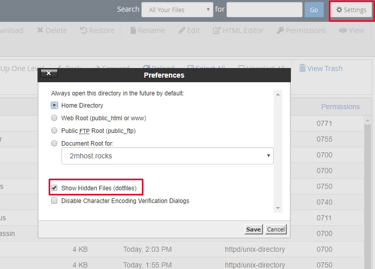2. In Settings, enable "Show hidden files (dotfiles)" option and Save.