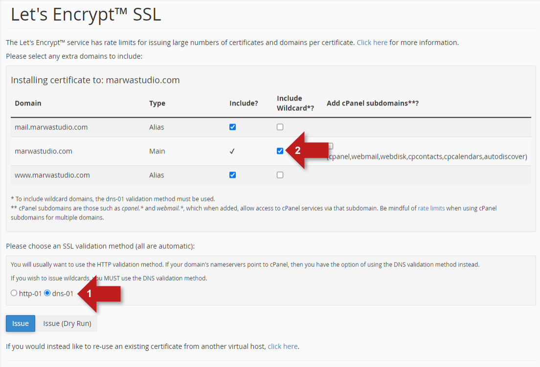 2MHost offers free wildcard SSL certificate for all hosted websites, you can install it from cPanel > Let's Encrypt SSL and choose the wildcard option as follow: