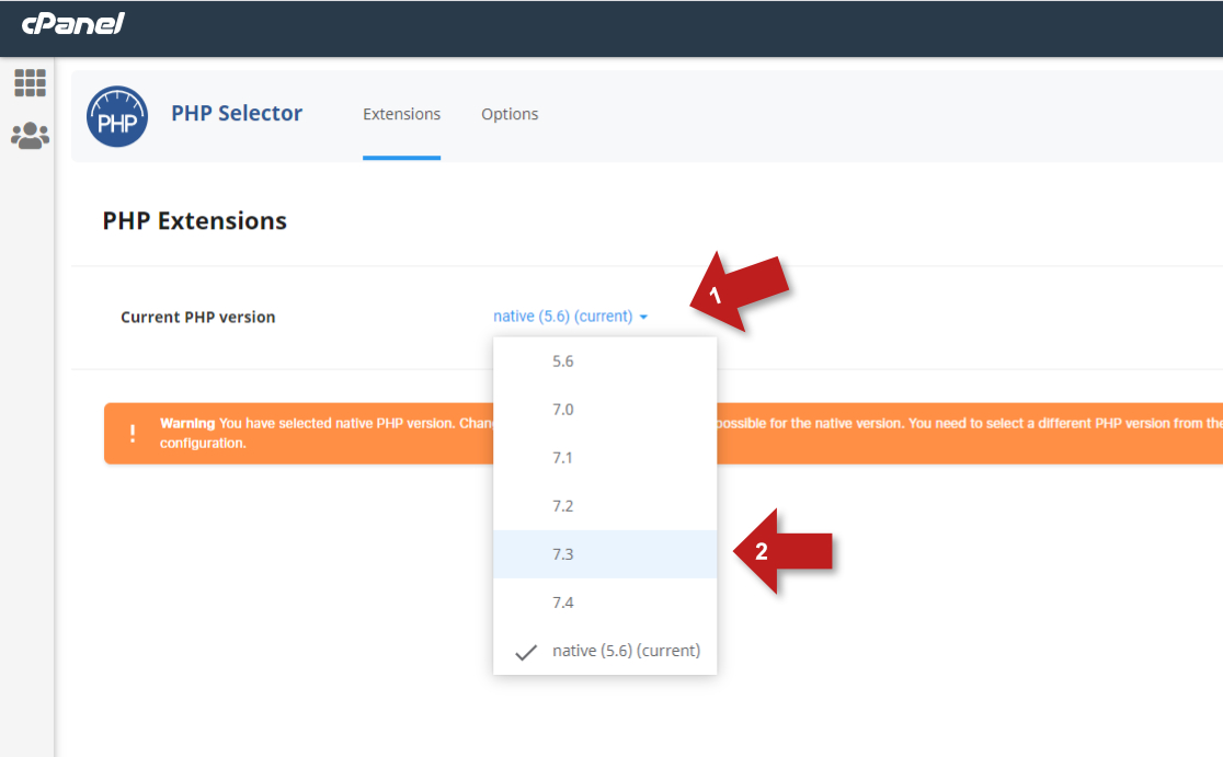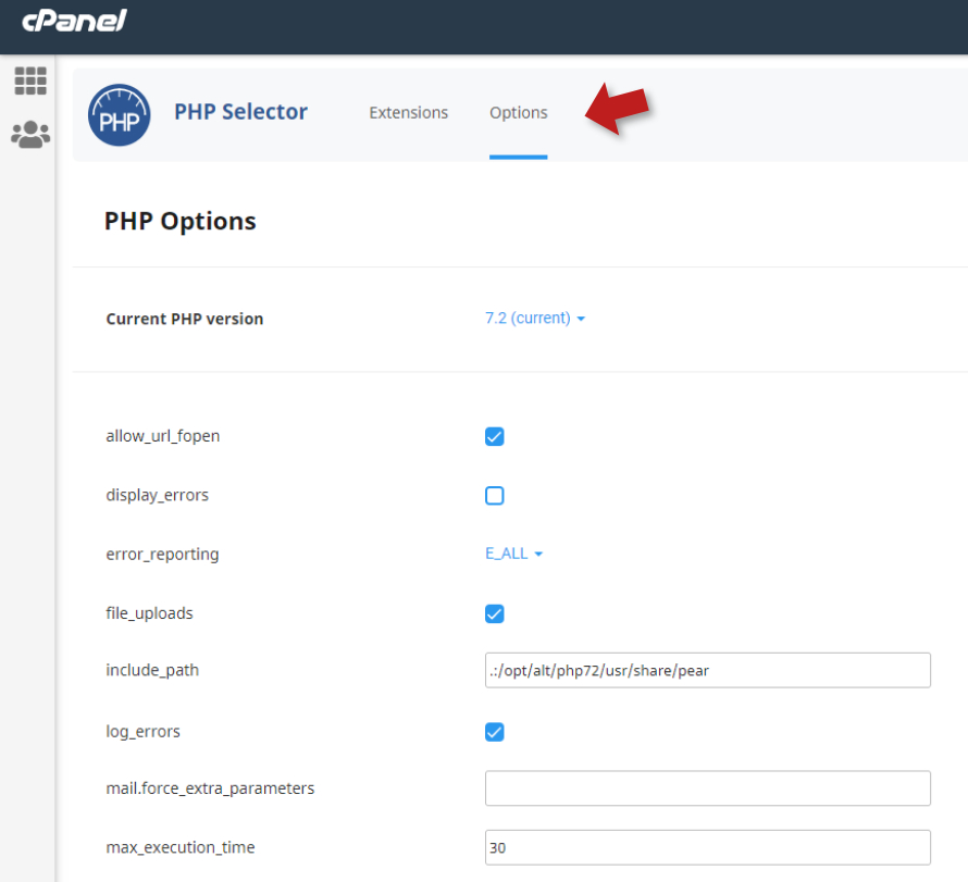 To modify PHP variables, you'll need to select a non-native PHP version from your cPanel. This is because the native PHP version (used by all websites on the server) can't be customized. Choose a non-native PHP version, and then you'll be able to adjust the settings to suit your needs: