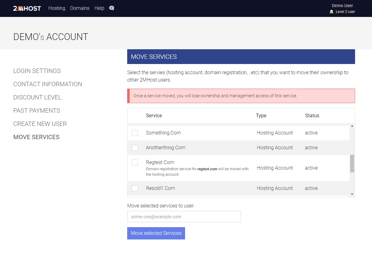You can move services (hosting accounts, domain names) between users from your admin area > profile menu > Move Services: