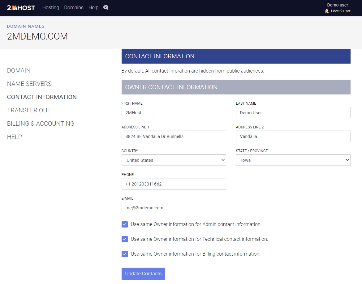 You can update your contact information from your admin area > domains > select domain > contact information tab: