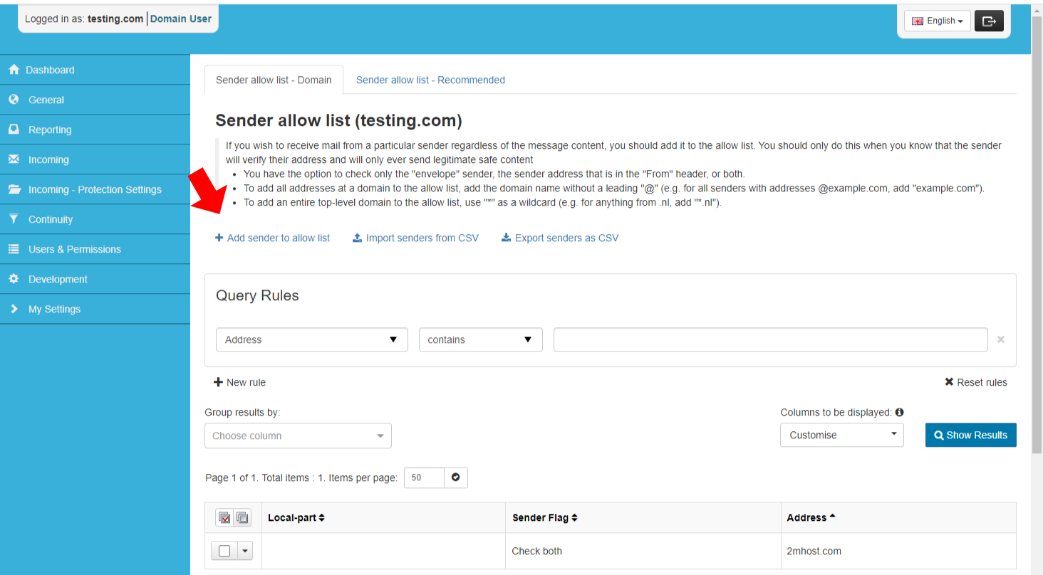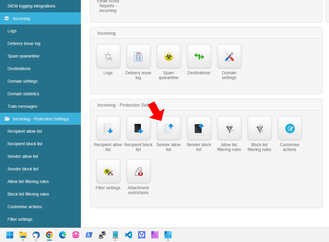- Scroll down to 'Incoming - Protection Settings' tab and click on 'Sender allow list'.