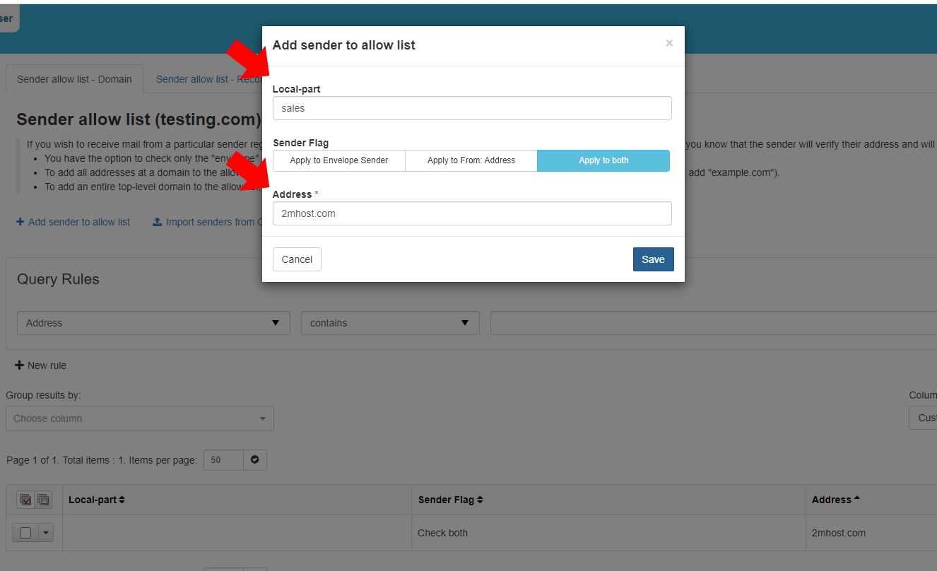 - If you want to white-list sales@2mhost.com, then add sales in Local-part field, and 2mhost.com in the address field, keep the sender flag field as is. If you want to whitelist all addresses @2mhost.com, then leave Local-part field empty.