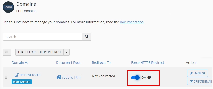 Once the SSL certificate gets installed, the next step is to force your website to load using HTTPS by default whenever you get a visitor, you can do that using your cPanel > domains section: