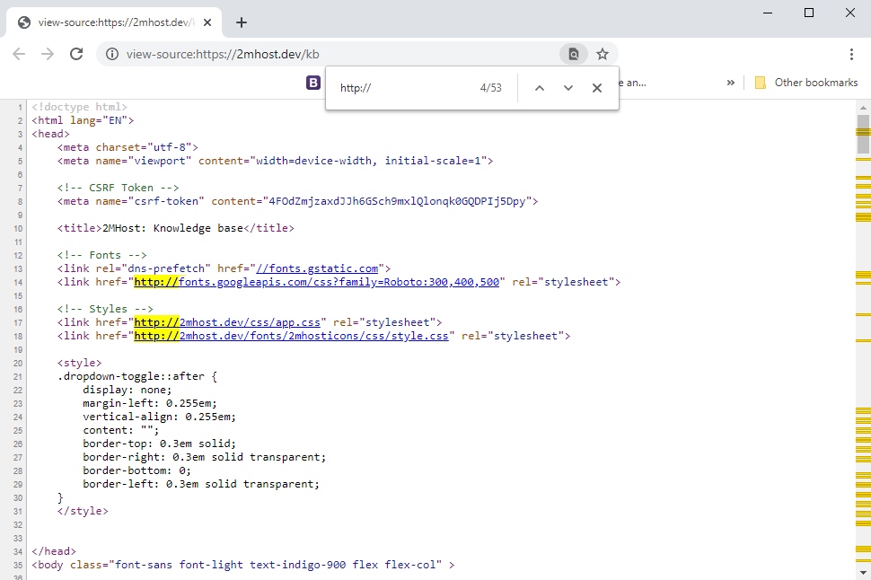 2. press Ctrl+F and search 'http://' to highlight the insecure resources