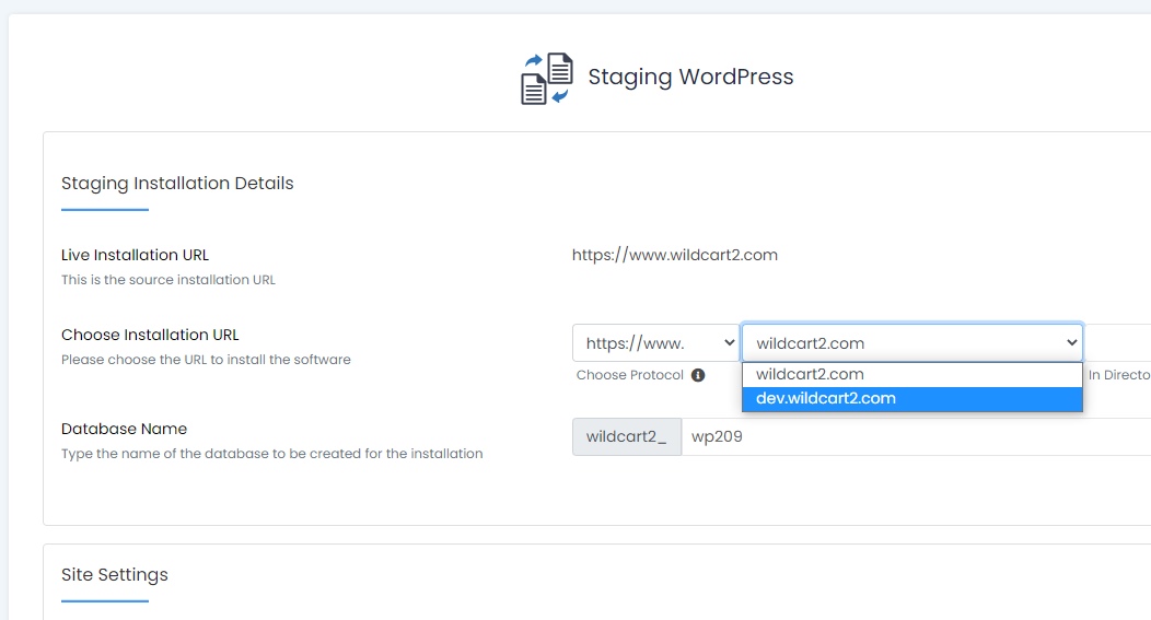 - Fill in the 'Staging Wordpress' form carefully, for 'Choose Installation URL' field, choose the subdomain you created in the first step.