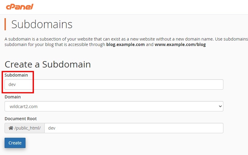 - Use your cPanel to create a staging subdomain, stick to dev.yourdomain.com, staging.yourdomain.com or test.yourdomain.com, in case of using commercial plugins or themes, usually the license will cover these subdomains too.