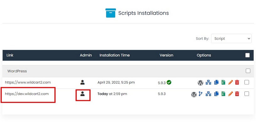 - Back to the list of installations, you can now login to the dashboard of the staging Wordpress, perform and test any changes you want.