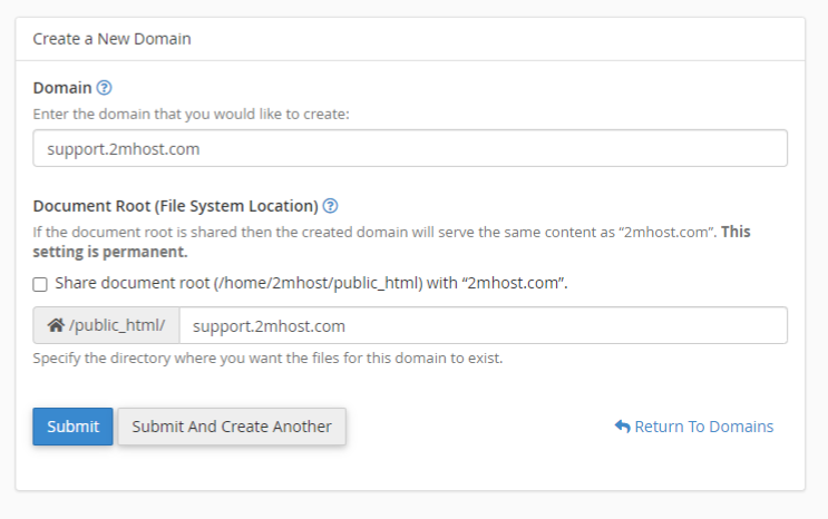 Here is how we can create subdomain support.2mhost.com in the cPanel of 2mhost.com, when we create the subdomain, a folder called support.2mhost.com will be created inside public_html of the main account (2mhost.com), we can upload the files of the subdomain inside the created folder.