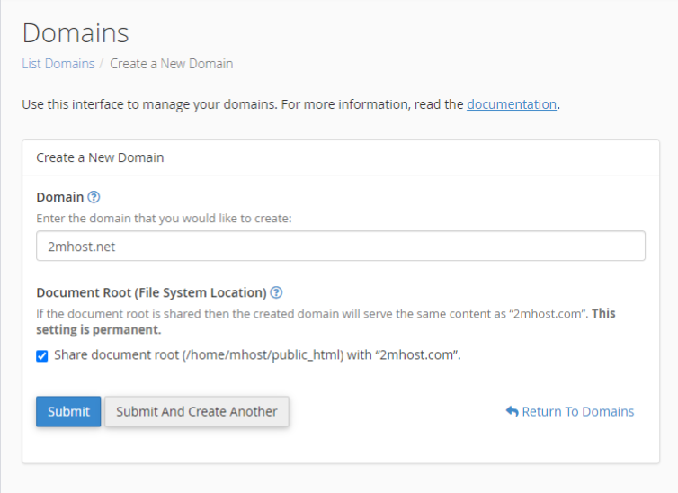 You can use cPanel to create aliases, and the function is free in all 2MHost web hosting packages, in the following example, we will create a domain alias called 2mhost.net that will load 2mhost.com website. Note that we leave 'share document root' checkbox checked.