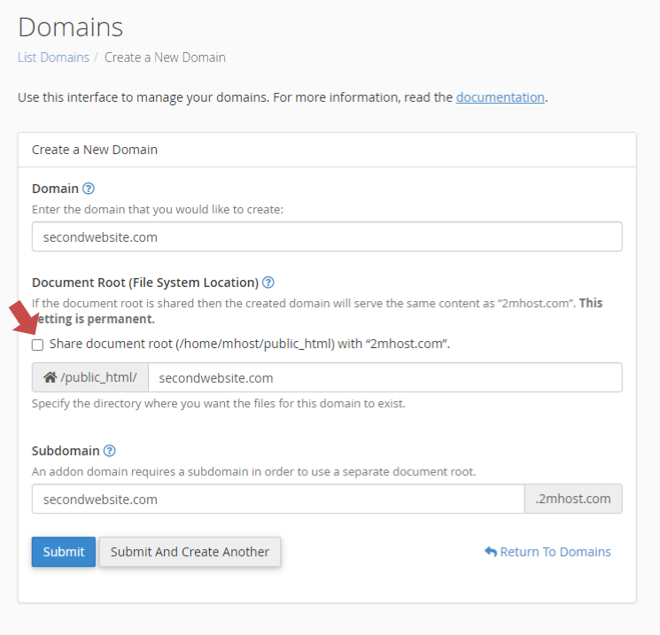 In the following example, we will add new domain secondwebsite.com to be full website hosted in the same package, note that we unchecked 'Share document root' checkbox.